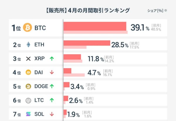 「販売所」では、ビットコイン(BTC)がシェア39.1%で、1位となった。前月3月のランキングと比較すると、ダイ(DAI)とリップル(XRP)のシェアが減少し、その分イーサリアム(ETH)のシェアが17.5%から28.5%に、11pt拡大する結果となった。